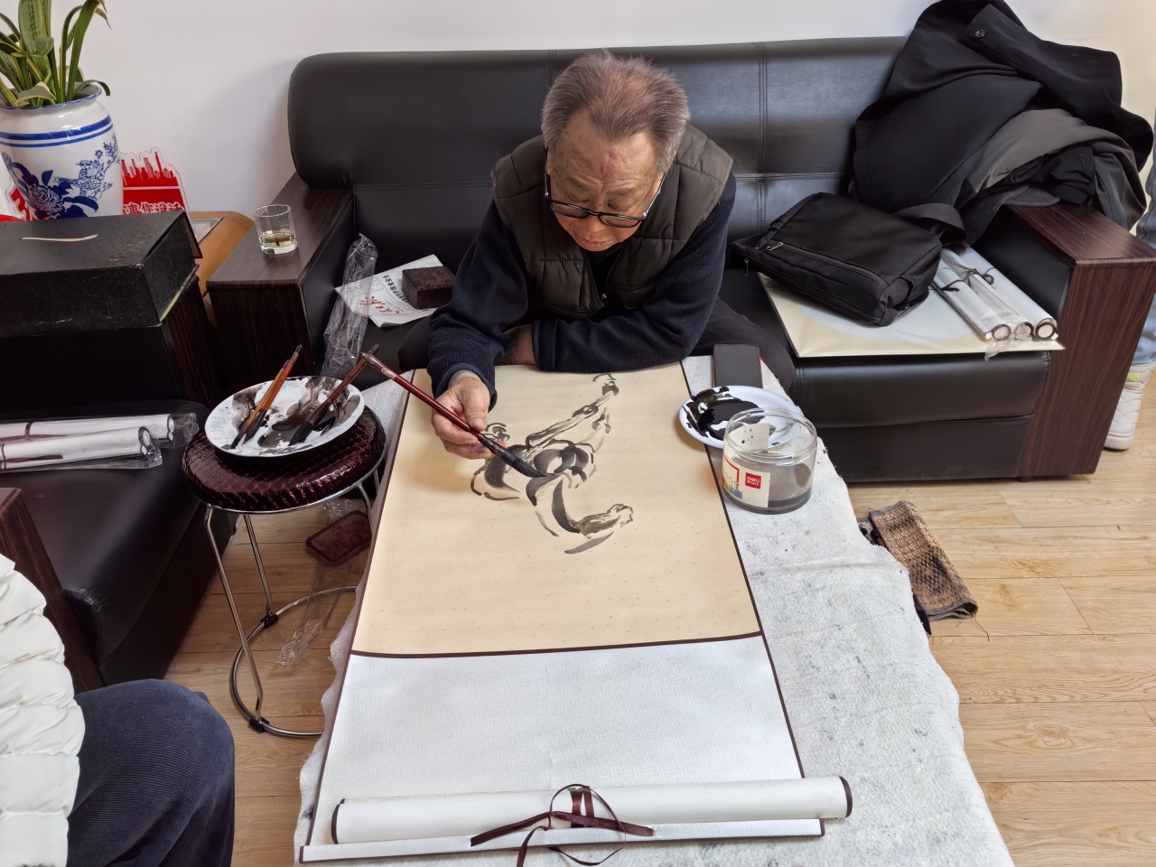 活动现场,墨香四溢,纸砚生辉,洋溢着喜庆热烈的节日气氛。书画艺术家们和志愿者们挥毫泼墨,各展其长。笔走龙蛇的书法区:一副副寓意吉祥、对仗工整的春联,一个个饱满圆润、气韵生动的“福”字,在行云流水间跃然纸上,将美好的新年祈愿凝聚于笔墨之中;彩绘丹青的绘画区:艺术家们巧运匠心,妙笔生花。画作中,骏马身形矫健,昂首奔腾,既呼应农历马年的生肖主题,更象征着龙马精神、一往无前的奋进姿态;而灵动游弋的鱼儿则描绘出“年年有鱼(余)”的生动图景,寓意富足安康、吉庆有余。这些栩栩如生的书画作品,不仅展现了深厚的艺术功力,更传递出丰厚的传统文化底蕴和积极向上的时代气息。